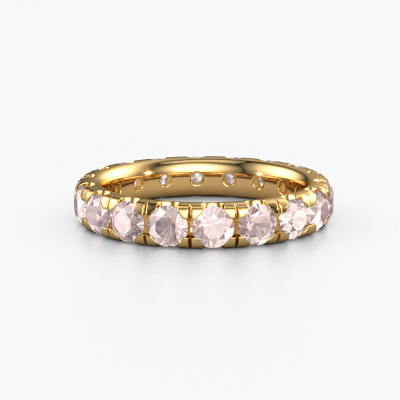 This is our Jackie 3.4 ring. This specific type is called an eternity ring and it is set with a continuous line of identically cut gemstones. The ring is made in 14 Carat gold and is set with small morganite champagne, 3.4 mm. This gold Eternity ring is a perfectly beautiful and meaningful way to give your proposal that special touch. The magnificent evenly shaped morganite champagne are pave set around the ring. The identical morganite champagne are carefully selected to give the ring a maximum effect. Do keep in mind we use natural resources so small differences between stones are common. The special effect is enhanced due to precise positioning of the morganite champagne. This requires the utmost precision and a skilful hand but for our skilled artisans this is what excites them. The result is a stackable ring with a row of morganite champagne which seem to have no beginning nor end. The perfect symbol of your love for her! Isn't she a beauty?