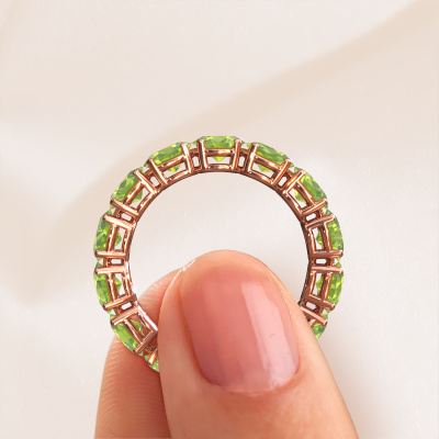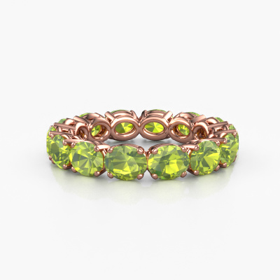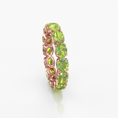 This is our Vivienne OVL 5x4 ring. This specific type is called an eternity ring and it is set with a continuous line of identically cut gemstones. The ring is made in 14 Carat rose gold and is set with small peridot, 5x4 mm. This rose gold Eternity ring is a perfectly beautiful and meaningful way to give your proposal that special touch. The magnificent evenly shaped peridot are pave set around the ring. The identical peridot are carefully selected to give the ring a maximum effect. Do keep in mind we use natural resources so small differences between stones are common. The special effect is enhanced due to precise positioning of the peridot. This requires the utmost precision and a skilful hand but for our skilled artisans this is what excites them. The result is a ring with a row of peridot which seem to have no beginning nor end. The perfect symbol of your love for her! Isn't she a beauty?By using our modern techniques, we can design and customize the finest quality jewels with the utmost care for you. Our rings are always priced 30 percent lower than other jewellers. We make rings to order, so we don't have to maintain a large stock. If you have a certain budget, we are more than happy to advice you accordingly.New jewellery designs are added to our online collection daily. Our team of passionate designers strive to create extraordinary and diverse designs. Have you seen a ring you like? Please feel free to contact us. Based on a good price/ quality ratio, we will make you an offer you can't refuse!To make it easier for you, we offer a 30 day return policy. Check our terms and conditions.