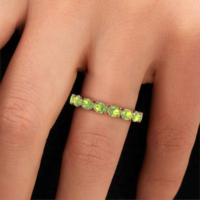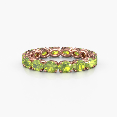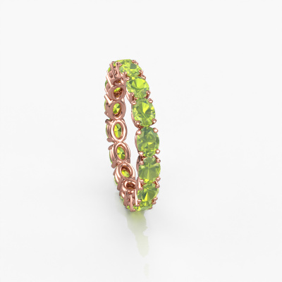 This is our Vivienne OVL 4x3 ring. This specific type is called an eternity ring and it is set with a continuous line of identically cut gemstones. The ring is made in 14 Carat rose gold and is set with small peridot, 4x3 mm. This rose gold Eternity ring is a perfectly beautiful and meaningful way to give your proposal that special touch. The magnificent evenly shaped peridot are pave set around the ring. The identical peridot are carefully selected to give the ring a maximum effect. Do keep in mind we use natural resources so small differences between stones are common. The special effect is enhanced due to precise positioning of the peridot. This requires the utmost precision and a skilful hand but for our skilled artisans this is what excites them. The result is a ring with a row of peridot which seem to have no beginning nor end. The perfect symbol of your love for her! Isn't she a beauty?Because we design and deliver our own rings, we can offer you a ring at a price you won't find anywhere else. A ring is made to order, which helps prevent excess supplies, so we can make you a great price offer. We understand it feels risky, buying your ring online, but we will gladly assist in the designing process, taking your budget into consideration.Our team of talented, passionate designers add new ring designs to our online collection daily. Our objective in doing so, is to be able to offer you a wide variety of jewels. Please feel free to request a quote if you have specific wishes for your ring. We guarantee to make you an offer you can't refuse.To make it easier for you, we offer a 30 day return policy. Check our terms and conditions.