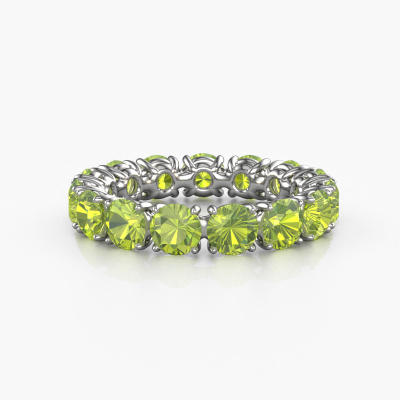 This is our Vivienne 4.2 ring. This specific type is called an eternity ring and it is set with a continuous line of identically cut gemstones. The ring is made in 14 Carat white gold and is set with small peridot, 4.2 mm. This white gold Eternity ring is a perfectly beautiful and meaningful way to give your proposal that special touch. The magnificent evenly shaped peridot are pave set around the ring. The identical peridot are carefully selected to give the ring a maximum effect. Do keep in mind we use natural resources so small differences between stones are common. The special effect is enhanced due to precise positioning of the peridot. This requires the utmost precision and a skilful hand but for our skilled artisans this is what excites them. The result is a ring with a row of peridot which seem to have no beginning nor end. The perfect symbol of your love for her! Isn't she a beauty?By using a combination of the latest modern techniques, combined with ancient crafting, we can make all our rings in our own studio. Each jewel is made to order. This is advantageous because we can offer you a price you won't find anywhere else.