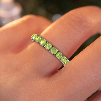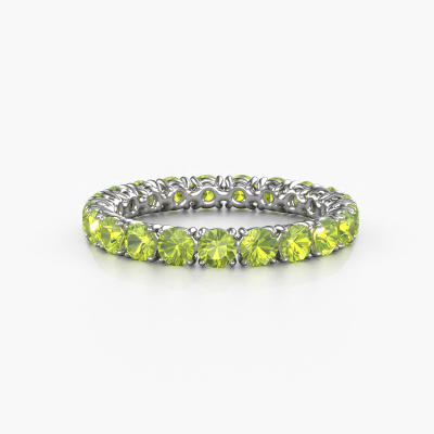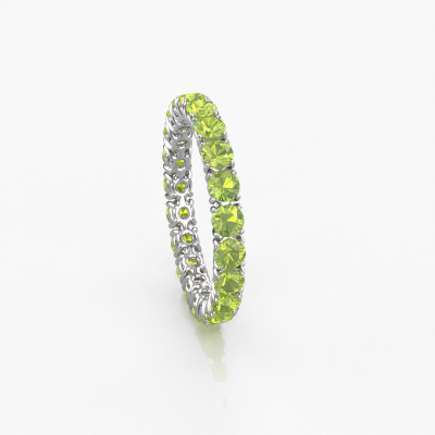 This is our Vivienne 2.9 ring. This specific type is called an eternity ring and it is set with a continuous line of identically cut gemstones. The ring is made in 14 Carat white gold and is set with small peridot, 2.9 mm. This white gold Eternity ring is a perfectly beautiful and meaningful way to give your proposal that special touch. The magnificent evenly shaped peridot are pave set around the ring. The identical peridot are carefully selected to give the ring a maximum effect. Do keep in mind we use natural resources so small differences between stones are common. The special effect is enhanced due to precise positioning of the peridot. This requires the utmost precision and a skilful hand but for our skilled artisans this is what excites them. The result is a ring with a row of peridot which seem to have no beginning nor end. The perfect symbol of your love for her! Isn't she a beauty?By using our modern techniques, we can design and customize the finest quality jewels with the utmost care for you. Our rings are always priced 30 percent lower than other jewellers. We make rings to order, so we don't have to maintain a large stock. If you have a certain budget, we are more than happy to advice you accordingly.New jewellery designs are added to our online collection daily. Our team of passionate designers strive to create extraordinary and diverse designs. Have you seen a ring you like? Please feel free to contact us. Based on a good price/ quality ratio, we will make you an offer you can't refuse!To make it easier for you, we offer a 30 day return policy. Check our terms and conditions.