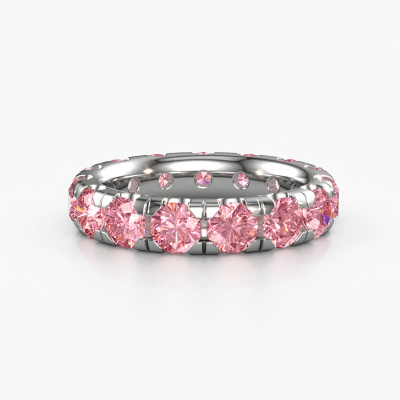 This is our Jackie 4.2 ring. This specific type is called an eternity ring and it is set with a continuous line of identically cut gemstones. The ring is made in platinum and is set with small pink lab grown diamonds, 4.2 mm. This platinum Eternity ring is a perfectly beautiful and meaningful way to give your proposal that special touch. The magnificent evenly shaped pink lab grown diamonds are pave set around the ring. The identical pink lab grown diamonds are carefully selected to give the ring a maximum effect. Do keep in mind we use natural resources so small differences between stones are common. The special effect is enhanced due to precise positioning of the pink lab grown diamonds. This requires the utmost precision and a skilful hand but for our skilled artisans this is what excites them. The result is a stackable ring with a row of pink lab grown diamonds which seem to have no beginning nor end. The perfect symbol of your love for her! Isn't she a beauty?