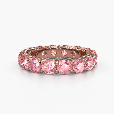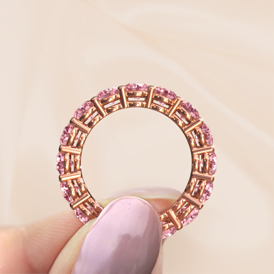 This is our Michelle full 4.2 ring. This specific type is called an eternity ring and it is set with a continuous line of identically cut gemstones. The ring is made in 14 Carat rose gold and is set with small pink lab grown diamonds, 4.2 mm. This rose gold Eternity ring is a perfectly beautiful and meaningful way to give your proposal that special touch. The magnificent evenly shaped pink lab grown diamonds are pave set around the ring. The identical pink lab grown diamonds are carefully selected to give the ring a maximum effect. Do keep in mind we use natural resources so small differences between stones are common. The special effect is enhanced due to precise positioning of the pink lab grown diamonds. This requires the utmost precision and a skilful hand but for our skilled artisans this is what excites them. The result is a stackable ring with a row of pink lab grown diamonds which seem to have no beginning nor end. The perfect symbol of your love for her! Isn't she a beauty?
