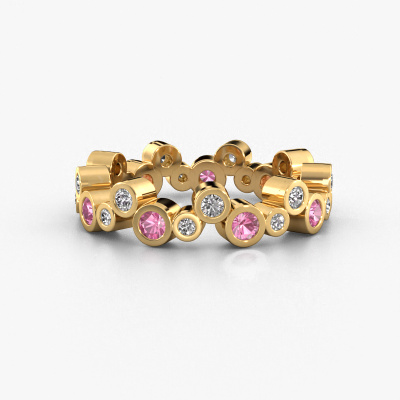This is our Tessa ring. This specific type is called an eternity ring and it is set with a continuous line of identically cut gemstones. The ring is made in 14 Carat gold and is set with small pink sapphire, 2.5 mm. This gold Eternity ring is a perfectly beautiful and meaningful way to give your proposal that special touch. The magnificent evenly shaped pink sapphire are pave set around the ring. The identical pink sapphire are carefully selected to give the ring a maximum effect. Do keep in mind we use natural resources so small differences between stones are common. The special effect is enhanced due to precise positioning of the pink sapphire. This requires the utmost precision and a skilful hand but for our skilled artisans this is what excites them. The result is a ring with a row of pink sapphire which seem to have no beginning nor end. The perfect symbol of your love for her! Isn't she a beauty?By using our modern techniques, we can design and customize the finest quality jewels with the utmost care for you. Our rings are always priced 30 percent lower than other jewellers. We make rings to order, so we don't have to maintain a large stock. If you have a certain budget, we are more than happy to advice you accordingly.Our talented designers add new designs to our online collection daily. Together they create a diverse collection of the finest jewellery. If you prefer to make a ring according your own design, please feel free to request a quote. We will make you an amazing offer, based on quality and price.To make it easier for you, we offer a 30 day return policy. Check our terms and conditions.