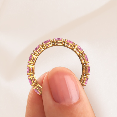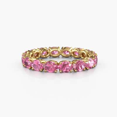 This is our Vivienne OVL 4x3 ring. This specific type is called an eternity ring and it is set with a continuous line of identically cut gemstones. The ring is made in 14 Carat gold and is set with small pink sapphire, 4x3 mm. This gold Eternity ring is a perfectly beautiful and meaningful way to give your proposal that special touch. The magnificent evenly shaped pink sapphire are pave set around the ring. The identical pink sapphire are carefully selected to give the ring a maximum effect. Do keep in mind we use natural resources so small differences between stones are common. The special effect is enhanced due to precise positioning of the pink sapphire. This requires the utmost precision and a skilful hand but for our skilled artisans this is what excites them. The result is a ring with a row of pink sapphire which seem to have no beginning nor end. The perfect symbol of your love for her! Isn't she a beauty?Because we design and deliver our own rings, we can offer you a ring at a price you won't find anywhere else. A ring is made to order, which helps prevent excess supplies, so we can make you a great price offer. We understand it feels risky, buying your ring online, but we will gladly assist in the designing process, taking your budget into consideration.Our team of talented, passionate designers add new ring designs to our online collection daily. Our objective in doing so, is to be able to offer you a wide variety of jewels. Please feel free to request a quote if you have specific wishes for your ring. We guarantee to make you an offer you can't refuse.To make it easier for you, we offer a 30 day return policy. Check our terms and conditions.