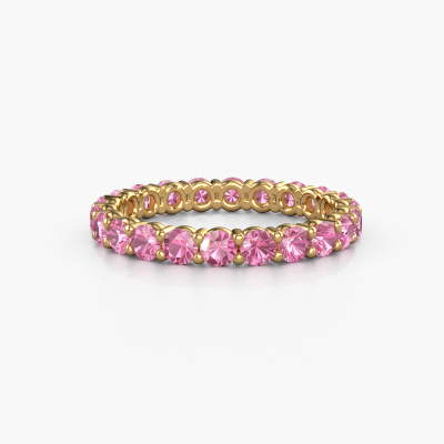 This is our Heddy rnd 2.7 ring. This specific type is called an eternity ring and it is set with a continuous line of identically cut gemstones. The ring is made in 14 Carat gold and is set with small pink sapphire, 2.7 mm. This gold Eternity ring is a perfectly beautiful and meaningful way to give your proposal that special touch. The magnificent evenly shaped pink sapphire are pave set around the ring. The identical pink sapphire are carefully selected to give the ring a maximum effect. Do keep in mind we use natural resources so small differences between stones are common. The special effect is enhanced due to precise positioning of the pink sapphire. This requires the utmost precision and a skilful hand but for our skilled artisans this is what excites them. The result is a stackable ring with a row of pink sapphire which seem to have no beginning nor end. The perfect symbol of your love for her! Isn't she a beauty?Because we design and deliver our own rings, we can offer you a ring at a price you won't find anywhere else. A ring is made to order, which helps prevent excess supplies, so we can make you a great price offer. We understand it feels risky, buying your ring online, but we will gladly assist in the designing process, taking your budget into consideration.Our team of talented, passionate designers add new ring designs to our online collection daily. Our objective in doing so, is to be able to offer you a wide variety of jewels. Please feel free to request a quote if you have specific wishes for your ring. We guarantee to make you an offer you can't refuse.To make it easier for you, we offer a 30 day return policy. Check our terms and conditions.