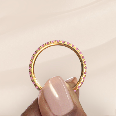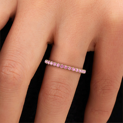 This is our Jackie 1.7 ring. This specific type is called an eternity ring and it is set with a continuous line of identically cut gemstones. The ring is made in 14 Carat gold and is set with small pink sapphire, 1.7 mm. This gold Eternity ring is a perfectly beautiful and meaningful way to give your proposal that special touch. The magnificent evenly shaped pink sapphire are pave set around the ring. The identical pink sapphire are carefully selected to give the ring a maximum effect. Do keep in mind we use natural resources so small differences between stones are common. The special effect is enhanced due to precise positioning of the pink sapphire. This requires the utmost precision and a skilful hand but for our skilled artisans this is what excites them. The result is a stackable ring with a row of pink sapphire which seem to have no beginning nor end. The perfect symbol of your love for her! Isn't she a beauty?After receiving your order, our goldsmiths will passionately start the creative process of making your ring in our own studio. Because we don't have a big stockpile, these costs will not be passed on to you. Our pricing is proof of that! We offer top quality jewels at lowest price, guaranteed.Our talented designers add new designs to our online collection daily. Together they create a diverse collection of the finest jewellery. If you prefer to make a ring according your own design, please feel free to request a quote. We will make you an amazing offer, based on quality and price.To make it easier for you, we offer a 30 day return policy. Check our terms and conditions.