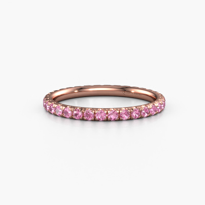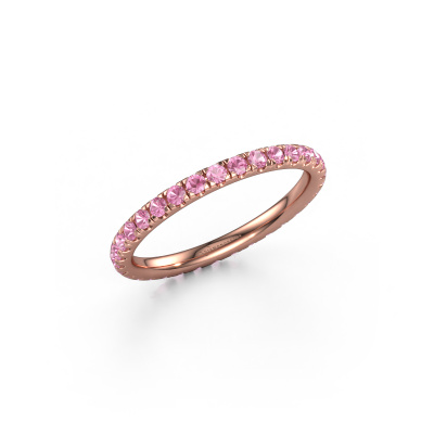 This is our Jackie 1.7 ring. This specific type is called an eternity ring and it is set with a continuous line of identically cut gemstones. The ring is made in 14 Carat rose gold and is set with small pink sapphire, 1.7 mm. This rose gold Eternity ring is a perfectly beautiful and meaningful way to give your proposal that special touch. The magnificent evenly shaped pink sapphire are pave set around the ring. The identical pink sapphire are carefully selected to give the ring a maximum effect. Do keep in mind we use natural resources so small differences between stones are common. The special effect is enhanced due to precise positioning of the pink sapphire. This requires the utmost precision and a skilful hand but for our skilled artisans this is what excites them. The result is a stackable ring with a row of pink sapphire which seem to have no beginning nor end. The perfect symbol of your love for her! Isn't she a beauty?After receiving your order, our goldsmiths will passionately start the creative process of making your ring in our own studio. Because we don't have a big stockpile, these costs will not be passed on to you. Our pricing is proof of that! We offer top quality jewels at lowest price, guaranteed.Our talented designers add new designs to our online collection daily. Together they create a diverse collection of the finest jewellery. If you prefer to make a ring according your own design, please feel free to request a quote. We will make you an amazing offer, based on quality and price.To make it easier for you, we offer a 30 day return policy. Check our terms and conditions.