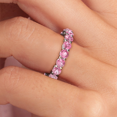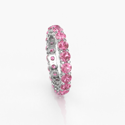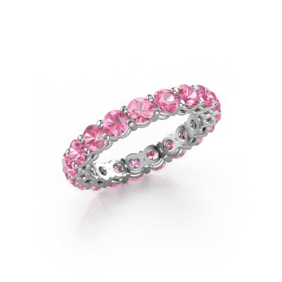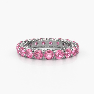 This is our Michelle full 3.4 ring. This specific type is called an eternity ring and it is set with a continuous line of identically cut gemstones. The ring is made in 14 Carat white gold and is set with small pink sapphire, 3.4 mm. This white gold Eternity ring is a perfectly beautiful and meaningful way to give your proposal that special touch. The magnificent evenly shaped pink sapphire are pave set around the ring. The identical pink sapphire are carefully selected to give the ring a maximum effect. Do keep in mind we use natural resources so small differences between stones are common. The special effect is enhanced due to precise positioning of the pink sapphire. This requires the utmost precision and a skilful hand but for our skilled artisans this is what excites them. The result is a stackable ring with a row of pink sapphire which seem to have no beginning nor end. The perfect symbol of your love for her! Isn't she a beauty?By using a combination of the latest modern techniques, combined with ancient crafting, we can make all our rings in our own studio. Each jewel is made to order. This is advantageous because we can offer you a price you won't find anywhere else.New jewellery designs are added to our online collection daily. Our team of passionate designers strive to create extraordinary and diverse designs. Have you seen a ring you like? Please feel free to contact us. Based on a good price/ quality ratio, we will make you an offer you can't refuse!To make it easier for you, we offer a 30 day return policy. Check our terms and conditions.