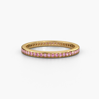 This is our Elvire 1 ring. This specific type is called an eternity ring and it is set with a continuous line of identically cut gemstones. The ring is made in 14 Carat gold and is set with small pink sapphire, 1.1 mm. This gold Eternity ring is a perfectly beautiful and meaningful way to give your proposal that special touch. The magnificent evenly shaped pink sapphire are pave set around the ring. The identical pink sapphire are carefully selected to give the ring a maximum effect. Do keep in mind we use natural resources so small differences between stones are common. The special effect is enhanced due to precise positioning of the pink sapphire. This requires the utmost precision and a skilful hand but for our skilled artisans this is what excites them. The result is a stackable ring with a row of pink sapphire which seem to have no beginning nor end. The perfect symbol of your love for her! Isn't she a beauty?After receiving your order, our goldsmiths will start the creative process of making your Elvire 1 ring. We don't keep stock. This is advantageous because these costs will not be passed on to you. Therefore, we can offer jewellery at exceptionally low prices.New jewellery designs are added to our online collection daily. Our team of passionate designers strive to create extraordinary and diverse designs. Have you seen a ring you like? Please feel free to contact us. Based on a good price/ quality ratio, we will make you an offer you can't refuse!To make it easier for you, we offer a 30 day return policy. Check our terms and conditions.