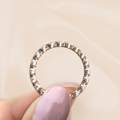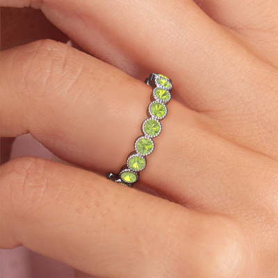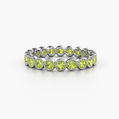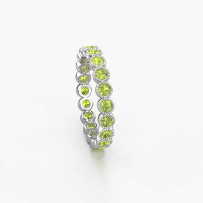 This is our Mariam 0.05 ring. This specific type is called an eternity ring and it is set with a continuous line of identically cut gemstones. The ring is made in platinum and is set with small peridot, 2.4 mm. The amazing peridot are identical in size and are set in the ring band. Our peridot are selected with great care so they are identical, which gives the best result. In order to get the best result, our artisans position all peridot by hand with the utmost care. Our Goldsmiths have one ambition, which is creating the perfect ring. That is why we love what we do. In the end you get a stunning modern platinum ring with a row of peridot which seem to have no beginning nor end. The perfect symbol of your undying love for her! How special is that!By using a combination of the latest modern techniques, combined with ancient crafting, we can make all our rings in our own studio. Each jewel is made to order. This is advantageous because we can offer you a price you won't find anywhere else.