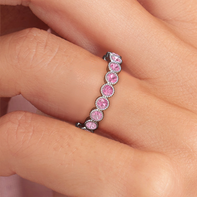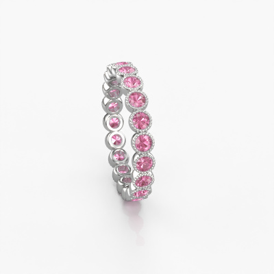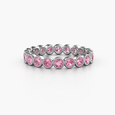 This is our Mariam 0.05 ring. This specific type is called an eternity ring and it is set with a continuous line of identically cut gemstones. The ring is made in platinum and is set with small pink sapphire, 2.4 mm. The amazing pink sapphire are identical in size and are set in the ring band. Our pink sapphire are selected with great care so they are identical, which gives the best result. In order to get the best result, our artisans position all pink sapphire by hand with the utmost care. Our Goldsmiths have one ambition, which is creating the perfect ring. That is why we love what we do. In the end you get a stunning modern platinum ring with a row of pink sapphire which seem to have no beginning nor end. The perfect symbol of your undying love for her! How special is that!By using a combination of the latest modern techniques, combined with ancient crafting, we can make all our rings in our own studio. Each jewel is made to order. This is advantageous because we can offer you a price you won't find anywhere else.