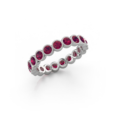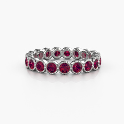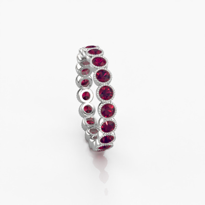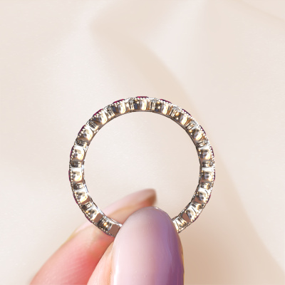 This is our Mariam 0.07 ring. This specific type is called an eternity ring and it is set with a continuous line of identically cut gemstones. The ring is made in platinum and is set with small rhodolite, 2.7 mm. The amazing rhodolite are identical in size and are set in the ring band. Our rhodolite are selected with great care so they are identical, which gives the best result. In order to get the best result, our artisans position all rhodolite by hand with the utmost care. Our Goldsmiths have one ambition, which is creating the perfect ring. That is why we love what we do. In the end you get a stunning trendy platinum ring with a row of rhodolite which seem to have no beginning nor end. The perfect symbol of your undying love for her! How special is that!After receiving your order, our goldsmiths will passionately start the creative process of making your ring in our own studio. Because we don't have a big stockpile, these costs will not be passed on to you. Our pricing is proof of that! We offer top quality jewels at lowest price, guaranteed.Our talented designers add new designs to our online collection daily. Together they create a diverse collection of the finest jewellery. If you prefer to make a ring according your own design, please feel free to request a quote. We will make you an amazing offer, based on quality and price.To make it easier for you, we offer a 30 day return policy. Check our terms and conditions.