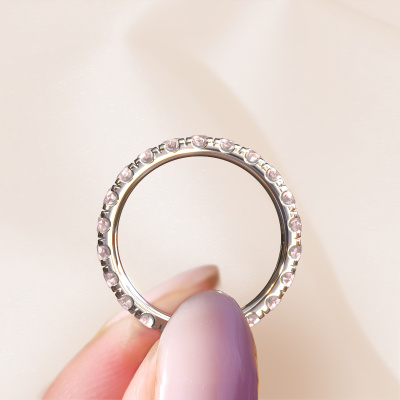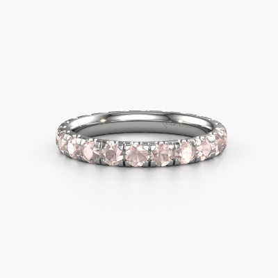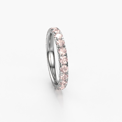 This is our Jackie 2.7 ring. This specific type is called an eternity ring and it is set with a continuous line of identically cut gemstones. The ring is made in platinum and is set with small morganite champagne, 2.7 mm. The amazing morganite champagne are identical in size and are set in the ring band. Our morganite champagne are selected with great care so they are identical, which gives the best result. In order to get the best result, our artisans position all morganite champagne by hand with the utmost care. Our Goldsmiths have one ambition, which is creating the perfect ring. That is why we love what we do. In the end you get a stunning contemporary platinum stackable ring with a row of morganite champagne which seem to have no beginning nor end. The perfect symbol of your undying love for her! How special is that!