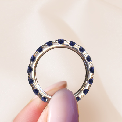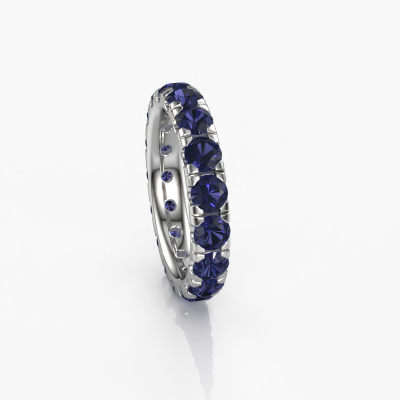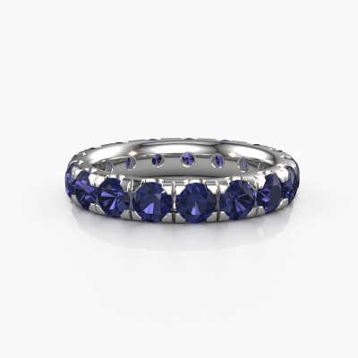 This is our Jackie 3.7 ring. This specific type is called an eternity ring and it is set with a continuous line of identically cut gemstones. The ring is made in platinum and is set with small sapphire, 3.7 mm. The amazing sapphire are identical in size and are set in the ring band. Our sapphire are selected with great care so they are identical, which gives the best result. In order to get the best result, our artisans position all sapphire by hand with the utmost care. Our Goldsmiths have one ambition, which is creating the perfect ring. That is why we love what we do. In the end you get a stunning modern platinum stackable ring with a row of sapphire which seem to have no beginning nor end. The perfect symbol of your undying love for her! How special is that!By using our modern techniques, we can design and customize the finest quality jewels with the utmost care for you. Our rings are always priced 30 percent lower than other jewellers. We make rings to order, so we don't have to maintain a large stock. If you have a certain budget, we are more than happy to advice you accordingly.New jewellery designs are added to our online collection daily. Our team of passionate designers strive to create extraordinary and diverse designs. Have you seen a ring you like? Please feel free to contact us. Based on a good price/ quality ratio, we will make you an offer you can't refuse!To make it easier for you, we offer a 30 day return policy. Check our terms and conditions.