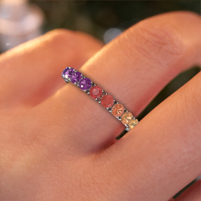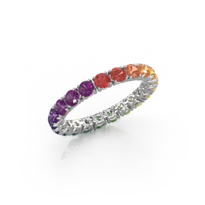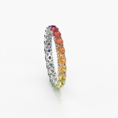 This is our Vivienne 2.9 ring. This specific type is called an eternity ring and it is set with a continuous line of identically cut gemstones. The ring is made in 14 Carat white gold and is set with small Rainbow sapphire 1, 2.9 mm. This white gold Eternity ring is a perfectly beautiful and meaningful way to give your proposal that special touch. The magnificent evenly shaped Rainbow sapphire 1 are pave set around the ring. The identical Rainbow sapphire 1 are carefully selected to give the ring a maximum effect. Do keep in mind we use natural resources so small differences between stones are common. The special effect is enhanced due to precise positioning of the Rainbow sapphire 1. This requires the utmost precision and a skilful hand but for our skilled artisans this is what excites them. The result is a ring with a row of Rainbow sapphire 1 which seem to have no beginning nor end. The perfect symbol of your love for her! Isn't she a beauty?By using our modern techniques, we can design and customize the finest quality jewels with the utmost care for you. Our rings are always priced 30 percent lower than other jewellers. We make rings to order, so we don't have to maintain a large stock. If you have a certain budget, we are more than happy to advice you accordingly.New jewellery designs are added to our online collection daily. Our team of passionate designers strive to create extraordinary and diverse designs. Have you seen a ring you like? Please feel free to contact us. Based on a good price/ quality ratio, we will make you an offer you can't refuse!To make it easier for you, we offer a 30 day return policy. Check our terms and conditions.
