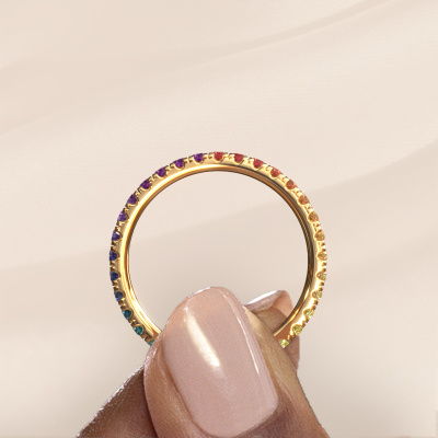 This is our Jackie 1.7 ring. This specific type is called an eternity ring and it is set with a continuous line of identically cut gemstones. The ring is made in 14 Carat gold and is set with small Rainbow sapphire 1, 1.7 mm. This gold Eternity ring is a perfectly beautiful and meaningful way to give your proposal that special touch. The magnificent evenly shaped Rainbow sapphire 1 are pave set around the ring. The identical Rainbow sapphire 1 are carefully selected to give the ring a maximum effect. Do keep in mind we use natural resources so small differences between stones are common. The special effect is enhanced due to precise positioning of the Rainbow sapphire 1. This requires the utmost precision and a skilful hand but for our skilled artisans this is what excites them. The result is a stackable ring with a row of Rainbow sapphire 1 which seem to have no beginning nor end. The perfect symbol of your love for her! Isn't she a beauty?After receiving your order, our goldsmiths will passionately start the creative process of making your ring in our own studio. Because we don't have a big stockpile, these costs will not be passed on to you. Our pricing is proof of that! We offer top quality jewels at lowest price, guaranteed.Our talented designers add new designs to our online collection daily. Together they create a diverse collection of the finest jewellery. If you prefer to make a ring according your own design, please feel free to request a quote. We will make you an amazing offer, based on quality and price.To make it easier for you, we offer a 30 day return policy. Check our terms and conditions.