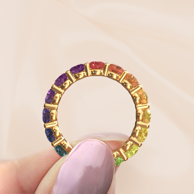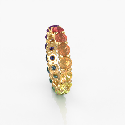 This Heddy rnd 4.0 stackable ring in 14 Carat gold is set with Rainbow sapphire 1. This gold stacked Heddy rnd 4.0 ring is the perfect addition to your ring collection! As the name suggests, it is a ring which can be combined on one finger with another ring. It gives you the opportunity to create your own style. A stacked ring usually represents a certain memory of someone special or a memorable moment. It is common to combine a stacked ring, representing an anniversary, with a wedding ring. But this eternity ring, combined with your other rings, also makes a classy fashion item. How do you like this exclusive gold stackable ring? Simply customize this Heddy rnd 4.0 stackable ring, using our online tool. Subsequently, your personal eternity Heddy rnd 4.0 stackable ring will be made by hand by our goldsmiths. Precious metals and gemstones can be customized to your liking. Do you have specific preferences which are unavailable in our online tool? Please feel free to contact us. We will customize your personal exclusive stackable ring to your liking.Are you on a budget? Please feel free to contact us, so we can go discuss your options. We offer our rings at guaranteed best price, because we make them to order. You won't find such a price anywhere else!To make it easier for you, we offer a 30 day return policy. Check our terms and conditions.