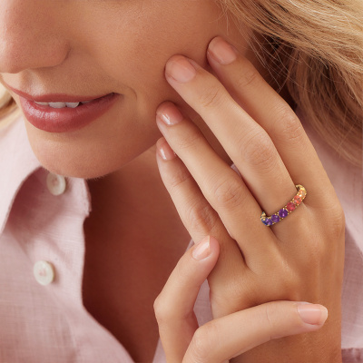 This Vivienne 4.0 stackable ring in 14 Carat gold is set with Rainbow sapphire 1. This gold stacked Vivienne 4.0 ring is the perfect addition to your ring collection! As the name suggests, it is a ring which can be combined on one finger with another ring. It gives you the opportunity to create your own style. A stacked ring usually represents a certain memory of someone special or a memorable moment. It is common to combine a stacked ring, representing an anniversary, with a wedding ring. But this eternity ring, combined with your other rings, also makes a classy fashion item. A customized modern stackable ring is the perfect gift! New exquisite designs are added daily by our team of passionate goldsmiths. And each design can be customized. Simply customize the precious metals and the colour of gemstones which will be used, for example. This makes your design of the modern Vivienne 4.0 stackable ring truly unique!Because we design and deliver our own rings, we can offer you a ring at a price you won't find anywhere else. A ring is made to order, which helps prevent excess supplies, so we can make you a great price offer. We understand it feels risky, buying your ring online, but we will gladly assist in the designing process, taking your budget into consideration.To make it easier for you, we offer a 30 day return policy. Check our terms and conditions.