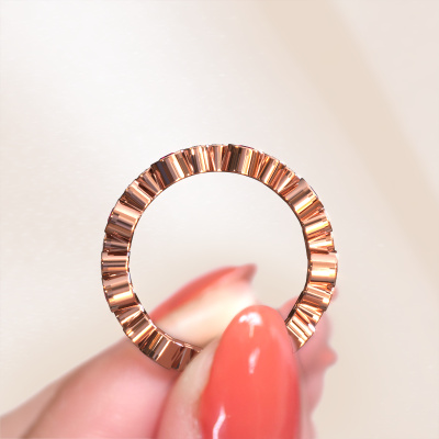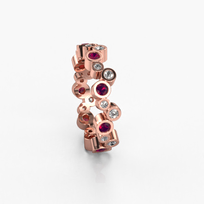 This is our Tessa ring. This specific type is called an eternity ring and it is set with a continuous line of identically cut gemstones. The ring is made in 14 Carat rose gold and is set with small rhodolite, 2.5 mm. This rose gold Eternity ring is a perfectly beautiful and meaningful way to give your proposal that special touch. The magnificent evenly shaped rhodolite are pave set around the ring. The identical rhodolite are carefully selected to give the ring a maximum effect. Do keep in mind we use natural resources so small differences between stones are common. The special effect is enhanced due to precise positioning of the rhodolite. This requires the utmost precision and a skilful hand but for our skilled artisans this is what excites them. The result is a ring with a row of rhodolite which seem to have no beginning nor end. The perfect symbol of your love for her! Isn't she a beauty?By using our modern techniques, we can design and customize the finest quality jewels with the utmost care for you. Our rings are always priced 30 percent lower than other jewellers. We make rings to order, so we don't have to maintain a large stock. If you have a certain budget, we are more than happy to advice you accordingly.Our talented designers add new designs to our online collection daily. Together they create a diverse collection of the finest jewellery. If you prefer to make a ring according your own design, please feel free to request a quote. We will make you an amazing offer, based on quality and price.To make it easier for you, we offer a 30 day return policy. Check our terms and conditions.