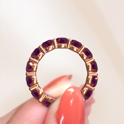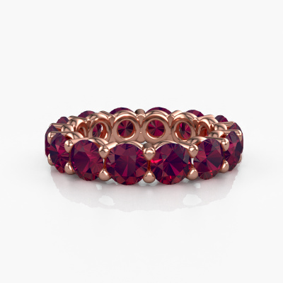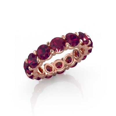 This is our Heddy rnd 4.7 ring. This specific type is called an eternity ring and it is set with a continuous line of identically cut gemstones. The ring is made in 14 Carat rose gold and is set with small rhodolite, 4.7 mm. This rose gold Eternity ring is a perfectly beautiful and meaningful way to give your proposal that special touch. The magnificent evenly shaped rhodolite are pave set around the ring. The identical rhodolite are carefully selected to give the ring a maximum effect. Do keep in mind we use natural resources so small differences between stones are common. The special effect is enhanced due to precise positioning of the rhodolite. This requires the utmost precision and a skilful hand but for our skilled artisans this is what excites them. The result is a ring with a row of rhodolite which seem to have no beginning nor end. The perfect symbol of your love for her! Isn't she a beauty?Because we design and deliver our own rings, we can offer you a ring at a price you won't find anywhere else. A ring is made to order, which helps prevent excess supplies, so we can make you a great price offer. We understand it feels risky, buying your ring online, but we will gladly assist in the designing process, taking your budget into consideration.Our team of talented, passionate designers add new ring designs to our online collection daily. Our objective in doing so, is to be able to offer you a wide variety of jewels. Please feel free to request a quote if you have specific wishes for your ring. We guarantee to make you an offer you can't refuse.To make it easier for you, we offer a 30 day return policy. Check our terms and conditions.