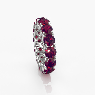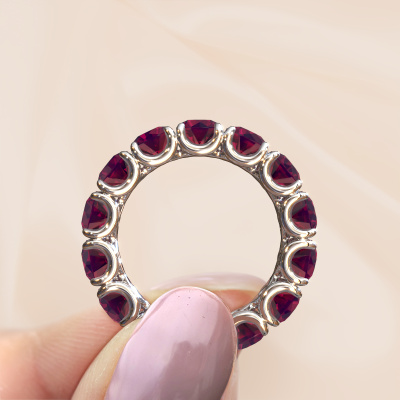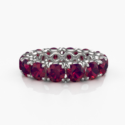 This is our Estee 4.7 ring. This specific type is called an eternity ring and it is set with a continuous line of identically cut gemstones. The ring is made in 14 Carat white gold and is set with small rhodolite, 4.7 mm. This white gold Eternity ring is a perfectly beautiful and meaningful way to give your proposal that special touch. The magnificent evenly shaped rhodolite are pave set around the ring. The identical rhodolite are carefully selected to give the ring a maximum effect. Do keep in mind we use natural resources so small differences between stones are common. The special effect is enhanced due to precise positioning of the rhodolite. This requires the utmost precision and a skilful hand but for our skilled artisans this is what excites them. The result is a ring with a row of rhodolite which seem to have no beginning nor end. The perfect symbol of your love for her! Isn't she a beauty?By using our modern techniques, we can design and customize the finest quality jewels with the utmost care for you. Our rings are always priced 30 percent lower than other jewellers. We make rings to order, so we don't have to maintain a large stock. If you have a certain budget, we are more than happy to advice you accordingly.