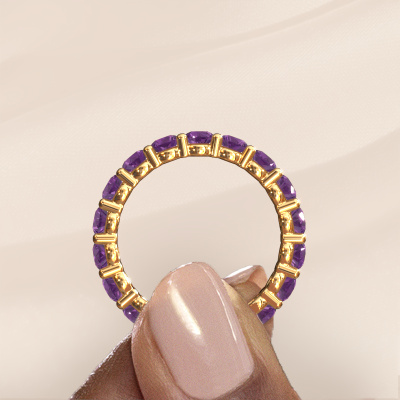 This is our Heddy rnd 3.4 ring. This specific type is called an eternity ring and it is set with a continuous line of identically cut gemstones. The ring is made in 14 Carat gold and is set with small amethysten, 3.4 mm. The amazing amethysten are identical in size and are set in the ring band. Our amethysten are selected with great care so they are identical, which gives the best result. In order to get the best result, our artisans position all amethysten by hand with the utmost care. Our Goldsmiths have one ambition, which is creating the perfect ring. That is why we love what we do. In the end you get a stunning modern gold ring with a row of amethysten which seem to have no beginning nor end. The perfect symbol of your undying love for her! How special is that!After receiving your order, our goldsmiths will passionately start the creative process of making your ring in our own studio. Because we don't have a big stockpile, these costs will not be passed on to you. Our pricing is proof of that! We offer top quality jewels at lowest price, guaranteed.Our talented designers add new designs to our online collection daily. Together they create a diverse collection of the finest jewellery. If you prefer to make a ring according your own design, please feel free to request a quote. We will make you an amazing offer, based on quality and price.To make it easier for you, we offer a 30 day return policy. Check our terms and conditions.