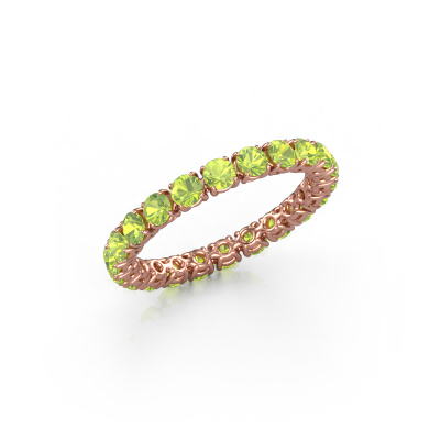 This is our Vivienne 2.7 ring. This specific type is called an eternity ring and it is set with a continuous line of identically cut gemstones. The ring is made in 14 Carat rose gold and is set with small peridot, 2.7 mm. The amazing peridot are identical in size and are set in the ring band. Our peridot are selected with great care so they are identical, which gives the best result. In order to get the best result, our artisans position all peridot by hand with the utmost care. Our Goldsmiths have one ambition, which is creating the perfect ring. That is why we love what we do. In the end you get a stunning classic rose gold ring with a row of peridot which seem to have no beginning nor end. The perfect symbol of your undying love for her! How special is that!After receiving your order, our goldsmiths will passionately start the creative process of making your ring in our own studio. Because we don't have a big stockpile, these costs will not be passed on to you. Our pricing is proof of that! We offer top quality jewels at lowest price, guaranteed.Our talented designers add new designs to our online collection daily. Together they create a diverse collection of the finest jewellery. If you prefer to make a ring according your own design, please feel free to request a quote. We will make you an amazing offer, based on quality and price.To make it easier for you, we offer a 30 day return policy. Check our terms and conditions.