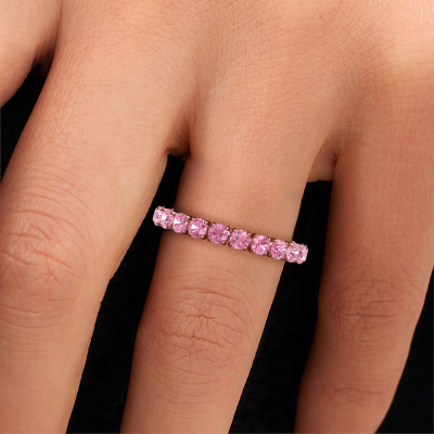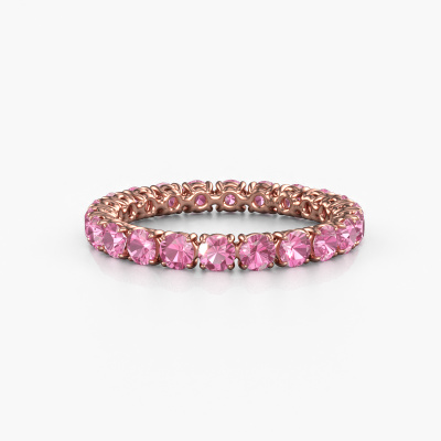 This is our Vivienne 2.7 ring. This specific type is called an eternity ring and it is set with a continuous line of identically cut gemstones. The ring is made in 14 Carat rose gold and is set with small pink sapphire, 2.7 mm. The amazing pink sapphire are identical in size and are set in the ring band. Our pink sapphire are selected with great care so they are identical, which gives the best result. In order to get the best result, our artisans position all pink sapphire by hand with the utmost care. Our Goldsmiths have one ambition, which is creating the perfect ring. That is why we love what we do. In the end you get a stunning classic rose gold ring with a row of pink sapphire which seem to have no beginning nor end. The perfect symbol of your undying love for her! How special is that!After receiving your order, our goldsmiths will passionately start the creative process of making your ring in our own studio. Because we don't have a big stockpile, these costs will not be passed on to you. Our pricing is proof of that! We offer top quality jewels at lowest price, guaranteed.Our talented designers add new designs to our online collection daily. Together they create a diverse collection of the finest jewellery. If you prefer to make a ring according your own design, please feel free to request a quote. We will make you an amazing offer, based on quality and price.To make it easier for you, we offer a 30 day return policy. Check our terms and conditions.