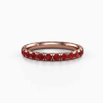 This is our Jackie 2.3 ring. This specific type is called an eternity ring and it is set with a continuous line of identically cut gemstones. The ring is made in 14 Carat rose gold and is set with small ruby, 2.3 mm. The amazing ruby are identical in size and are set in the ring band. Our ruby are selected with great care so they are identical, which gives the best result. In order to get the best result, our artisans position all ruby by hand with the utmost care. Our Goldsmiths have one ambition, which is creating the perfect ring. That is why we love what we do. In the end you get a stunning modern rose gold ring with a row of ruby which seem to have no beginning nor end. The perfect symbol of your undying love for her! How special is that!Are you on a budget? Please feel free to contact us, so we can go discuss your options. We offer our rings at guaranteed best price, because we make them to order. You won't find such a price anywhere else!Our team of talented, passionate designers add new ring designs to our online collection daily. Our objective in doing so, is to be able to offer you a wide variety of jewels. Please feel free to request a quote if you have specific wishes for your ring. We guarantee to make you an offer you can't refuse.To make it easier for you, we offer a 30 day return policy. Check our terms and conditions.