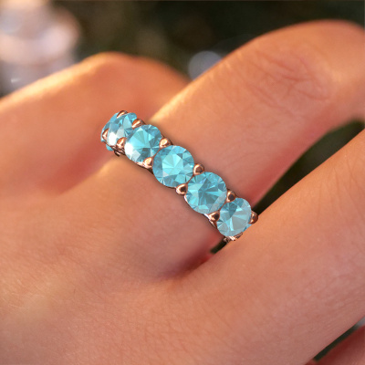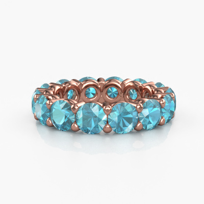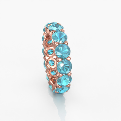 This is our Heddy rnd 5.0 ring. This specific type is called an eternity ring and it is set with a continuous line of identically cut gemstones. The ring is made in 14 Carat rose gold and is set with small blue topaz, 5 mm. The amazing blue topaz are identical in size and are set in the ring band. Our blue topaz are selected with great care so they are identical, which gives the best result. In order to get the best result, our artisans position all blue topaz by hand with the utmost care. Our Goldsmiths have one ambition, which is creating the perfect ring. That is why we love what we do. In the end you get a stunning exclusive rose gold ring with a row of blue topaz which seem to have no beginning nor end. The perfect symbol of your undying love for her! How special is that!By using a combination of the latest modern techniques, combined with ancient crafting, we can make all our rings in our own studio. Each jewel is made to order. This is advantageous because we can offer you a price you won't find anywhere else.