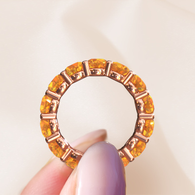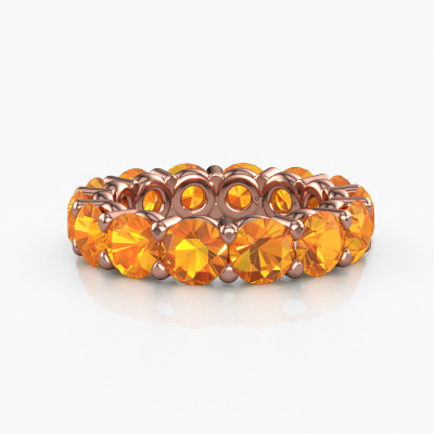 This is our Heddy rnd 5.0 ring. This specific type is called an eternity ring and it is set with a continuous line of identically cut gemstones. The ring is made in 14 Carat rose gold and is set with small citrin, 5 mm. The amazing citrin are identical in size and are set in the ring band. Our citrin are selected with great care so they are identical, which gives the best result. In order to get the best result, our artisans position all citrin by hand with the utmost care. Our Goldsmiths have one ambition, which is creating the perfect ring. That is why we love what we do. In the end you get a stunning exclusive rose gold ring with a row of citrin which seem to have no beginning nor end. The perfect symbol of your undying love for her! How special is that!By using a combination of the latest modern techniques, combined with ancient crafting, we can make all our rings in our own studio. Each jewel is made to order. This is advantageous because we can offer you a price you won't find anywhere else.