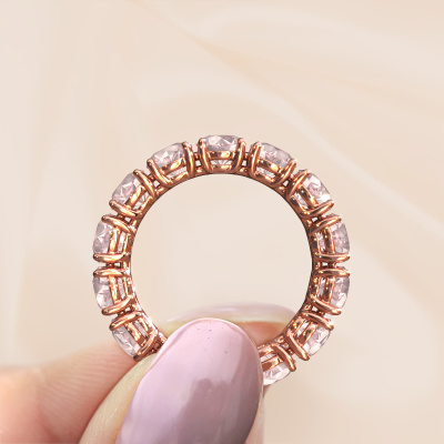This is our Vivienne 4.7 ring. This specific type is called an eternity ring and it is set with a continuous line of identically cut gemstones. The ring is made in 14 Carat rose gold and is set with small morganite champagne, 4.7 mm. The amazing morganite champagne are identical in size and are set in the ring band. Our morganite champagne are selected with great care so they are identical, which gives the best result. In order to get the best result, our artisans position all morganite champagne by hand with the utmost care. Our Goldsmiths have one ambition, which is creating the perfect ring. That is why we love what we do. In the end you get a stunning exclusive rose gold ring with a row of morganite champagne which seem to have no beginning nor end. The perfect symbol of your undying love for her! How special is that!After receiving your order, our goldsmiths will passionately start the creative process of making your ring in our own studio. Because we don't have a big stockpile, these costs will not be passed on to you. Our pricing is proof of that! We offer top quality jewels at lowest price, guaranteed.Our talented designers add new designs to our online collection daily. Together they create a diverse collection of the finest jewellery. If you prefer to make a ring according your own design, please feel free to request a quote. We will make you an amazing offer, based on quality and price.To make it easier for you, we offer a 30 day return policy. Check our terms and conditions.