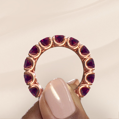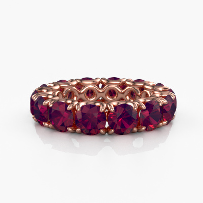 This is our Estee 5.0 ring. This specific type is called an eternity ring and it is set with a continuous line of identically cut gemstones. The ring is made in 14 Carat rose gold and is set with small rhodolite, 5 mm. The amazing rhodolite are identical in size and are set in the ring band. Our rhodolite are selected with great care so they are identical, which gives the best result. In order to get the best result, our artisans position all rhodolite by hand with the utmost care. Our Goldsmiths have one ambition, which is creating the perfect ring. That is why we love what we do. In the end you get a stunning exclusive rose gold ring with a row of rhodolite which seem to have no beginning nor end. The perfect symbol of your undying love for her! How special is that!Are you on a budget? Please feel free to contact us, so we can go discuss your options. We offer our rings at guaranteed best price, because we make them to order. You won't find such a price anywhere else!Our talented designers add new designs to our online collection daily. Together they create a diverse collection of the finest jewellery. If you prefer to make a ring according your own design, please feel free to request a quote. We will make you an amazing offer, based on quality and price.To make it easier for you, we offer a 30 day return policy. Check our terms and conditions.