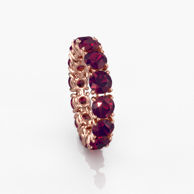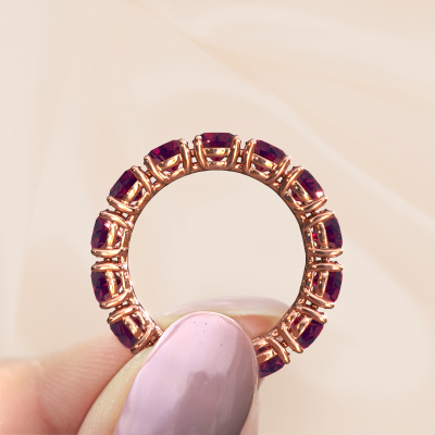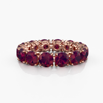 This is our Vivienne 4.7 ring. This specific type is called an eternity ring and it is set with a continuous line of identically cut gemstones. The ring is made in 14 Carat rose gold and is set with small rhodolite, 4.7 mm. The amazing rhodolite are identical in size and are set in the ring band. Our rhodolite are selected with great care so they are identical, which gives the best result. In order to get the best result, our artisans position all rhodolite by hand with the utmost care. Our Goldsmiths have one ambition, which is creating the perfect ring. That is why we love what we do. In the end you get a stunning exclusive rose gold ring with a row of rhodolite which seem to have no beginning nor end. The perfect symbol of your undying love for her! How special is that!After receiving your order, our goldsmiths will passionately start the creative process of making your ring in our own studio. Because we don't have a big stockpile, these costs will not be passed on to you. Our pricing is proof of that! We offer top quality jewels at lowest price, guaranteed.Our talented designers add new designs to our online collection daily. Together they create a diverse collection of the finest jewellery. If you prefer to make a ring according your own design, please feel free to request a quote. We will make you an amazing offer, based on quality and price.To make it easier for you, we offer a 30 day return policy. Check our terms and conditions.