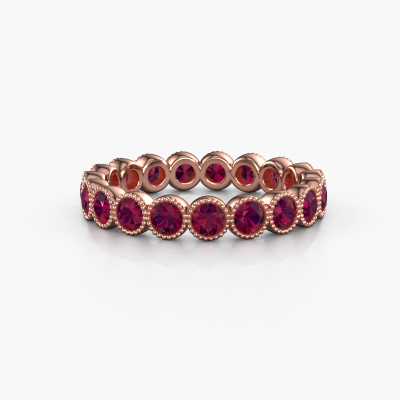 This is our Mariam 0.07 ring. This specific type is called an eternity ring and it is set with a continuous line of identically cut gemstones. The ring is made in 14 Carat rose gold and is set with small rhodolite, 2.7 mm. The amazing rhodolite are identical in size and are set in the ring band. Our rhodolite are selected with great care so they are identical, which gives the best result. In order to get the best result, our artisans position all rhodolite by hand with the utmost care. Our Goldsmiths have one ambition, which is creating the perfect ring. That is why we love what we do. In the end you get a stunning trendy rose gold ring with a row of rhodolite which seem to have no beginning nor end. The perfect symbol of your undying love for her! How special is that!After receiving your order, our goldsmiths will passionately start the creative process of making your ring in our own studio. Because we don't have a big stockpile, these costs will not be passed on to you. Our pricing is proof of that! We offer top quality jewels at lowest price, guaranteed.Our talented designers add new designs to our online collection daily. Together they create a diverse collection of the finest jewellery. If you prefer to make a ring according your own design, please feel free to request a quote. We will make you an amazing offer, based on quality and price.To make it easier for you, we offer a 30 day return policy. Check our terms and conditions.