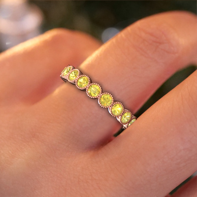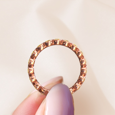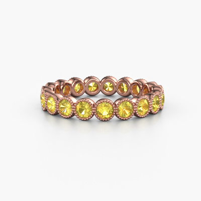 This is our Mariam 0.07 ring. This specific type is called an eternity ring and it is set with a continuous line of identically cut gemstones. The ring is made in 14 Carat rose gold and is set with small yellow sapphire, 2.7 mm. The amazing yellow sapphire are identical in size and are set in the ring band. Our yellow sapphire are selected with great care so they are identical, which gives the best result. In order to get the best result, our artisans position all yellow sapphire by hand with the utmost care. Our Goldsmiths have one ambition, which is creating the perfect ring. That is why we love what we do. In the end you get a stunning trendy rose gold ring with a row of yellow sapphire which seem to have no beginning nor end. The perfect symbol of your undying love for her! How special is that!After receiving your order, our goldsmiths will passionately start the creative process of making your ring in our own studio. Because we don't have a big stockpile, these costs will not be passed on to you. Our pricing is proof of that! We offer top quality jewels at lowest price, guaranteed.Our talented designers add new designs to our online collection daily. Together they create a diverse collection of the finest jewellery. If you prefer to make a ring according your own design, please feel free to request a quote. We will make you an amazing offer, based on quality and price.To make it easier for you, we offer a 30 day return policy. Check our terms and conditions.