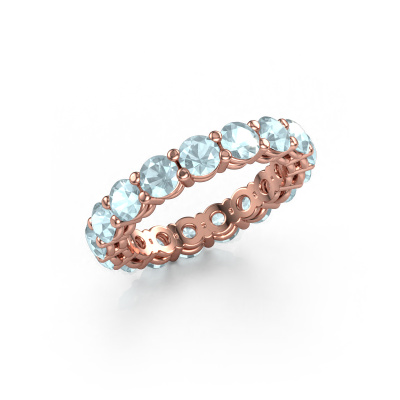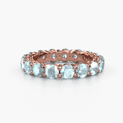 This is our Michelle full 3.7 ring. This specific type is called an eternity ring and it is set with a continuous line of identically cut gemstones. The ring is made in 14 Carat rose gold and is set with small aquamarine, 3.7 mm. The amazing aquamarine are identical in size and are set in the ring band. Our aquamarine are selected with great care so they are identical, which gives the best result. In order to get the best result, our artisans position all aquamarine by hand with the utmost care. Our Goldsmiths have one ambition, which is creating the perfect ring. That is why we love what we do. In the end you get a stunning modern rose gold stackable ring with a row of aquamarine which seem to have no beginning nor end. The perfect symbol of your undying love for her! How special is that!Because we design and deliver our own rings, we can offer you a ring at a price you won't find anywhere else. A ring is made to order, which helps prevent excess supplies, so we can make you a great price offer. We understand it feels risky, buying your ring online, but we will gladly assist in the designing process, taking your budget into consideration.Our team of talented, passionate designers add new ring designs to our online collection daily. Our objective in doing so, is to be able to offer you a wide variety of jewels. Please feel free to request a quote if you have specific wishes for your ring. We guarantee to make you an offer you can't refuse.To make it easier for you, we offer a 30 day return policy. Check our terms and conditions.