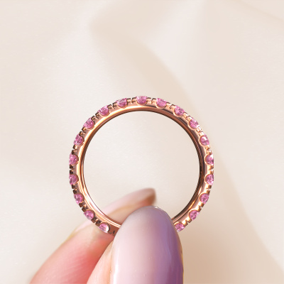 This is our Jackie 2.7 ring. This specific type is called an eternity ring and it is set with a continuous line of identically cut gemstones. The ring is made in 14 Carat rose gold and is set with small pink sapphire, 2.7 mm. The amazing pink sapphire are identical in size and are set in the ring band. Our pink sapphire are selected with great care so they are identical, which gives the best result. In order to get the best result, our artisans position all pink sapphire by hand with the utmost care. Our Goldsmiths have one ambition, which is creating the perfect ring. That is why we love what we do. In the end you get a stunning modern rose gold stackable ring with a row of pink sapphire which seem to have no beginning nor end. The perfect symbol of your undying love for her! How special is that!Because we design and deliver our own rings, we can offer you a ring at a price you won't find anywhere else. A ring is made to order, which helps prevent excess supplies, so we can make you a great price offer. We understand it feels risky, buying your ring online, but we will gladly assist in the designing process, taking your budget into consideration.Our team of talented, passionate designers add new ring designs to our online collection daily. Our objective in doing so, is to be able to offer you a wide variety of jewels. Please feel free to request a quote if you have specific wishes for your ring. We guarantee to make you an offer you can't refuse.To make it easier for you, we offer a 30 day return policy. Check our terms and conditions.
