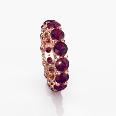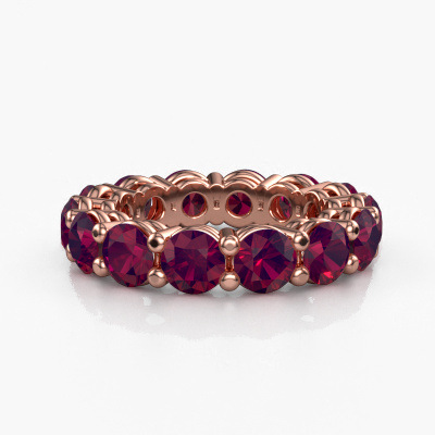 This is our Michelle full 4.7 ring. This specific type is called an eternity ring and it is set with a continuous line of identically cut gemstones. The ring is made in 14 Carat rose gold and is set with small rhodolite, 4.7 mm. The amazing rhodolite are identical in size and are set in the ring band. Our rhodolite are selected with great care so they are identical, which gives the best result. In order to get the best result, our artisans position all rhodolite by hand with the utmost care. Our Goldsmiths have one ambition, which is creating the perfect ring. That is why we love what we do. In the end you get a stunning exclusive rose gold stackable ring with a row of rhodolite which seem to have no beginning nor end. The perfect symbol of your undying love for her! How special is that!Because we design and deliver our own rings, we can offer you a ring at a price you won't find anywhere else. A ring is made to order, which helps prevent excess supplies, so we can make you a great price offer. We understand it feels risky, buying your ring online, but we will gladly assist in the designing process, taking your budget into consideration.Our team of talented, passionate designers add new ring designs to our online collection daily. Our objective in doing so, is to be able to offer you a wide variety of jewels. Please feel free to request a quote if you have specific wishes for your ring. We guarantee to make you an offer you can't refuse.To make it easier for you, we offer a 30 day return policy. Check our terms and conditions.