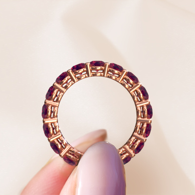 This is our Michelle full 3.7 ring. This specific type is called an eternity ring and it is set with a continuous line of identically cut gemstones. The ring is made in 14 Carat rose gold and is set with small rhodolite, 3.7 mm. The amazing rhodolite are identical in size and are set in the ring band. Our rhodolite are selected with great care so they are identical, which gives the best result. In order to get the best result, our artisans position all rhodolite by hand with the utmost care. Our Goldsmiths have one ambition, which is creating the perfect ring. That is why we love what we do. In the end you get a stunning modern rose gold stackable ring with a row of rhodolite which seem to have no beginning nor end. The perfect symbol of your undying love for her! How special is that!Because we design and deliver our own rings, we can offer you a ring at a price you won't find anywhere else. A ring is made to order, which helps prevent excess supplies, so we can make you a great price offer. We understand it feels risky, buying your ring online, but we will gladly assist in the designing process, taking your budget into consideration.Our team of talented, passionate designers add new ring designs to our online collection daily. Our objective in doing so, is to be able to offer you a wide variety of jewels. Please feel free to request a quote if you have specific wishes for your ring. We guarantee to make you an offer you can't refuse.To make it easier for you, we offer a 30 day return policy. Check our terms and conditions.