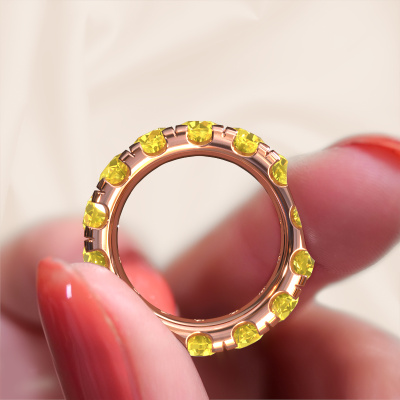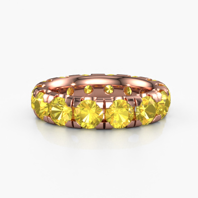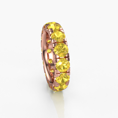 This is our Jackie 4.7 ring. This specific type is called an eternity ring and it is set with a continuous line of identically cut gemstones. The ring is made in 14 Carat rose gold and is set with small yellow sapphire, 4.7 mm. The amazing yellow sapphire are identical in size and are set in the ring band. Our yellow sapphire are selected with great care so they are identical, which gives the best result. In order to get the best result, our artisans position all yellow sapphire by hand with the utmost care. Our Goldsmiths have one ambition, which is creating the perfect ring. That is why we love what we do. In the end you get a stunning exclusive rose gold stackable ring with a row of yellow sapphire which seem to have no beginning nor end. The perfect symbol of your undying love for her! How special is that!Because we design and deliver our own rings, we can offer you a ring at a price you won't find anywhere else. A ring is made to order, which helps prevent excess supplies, so we can make you a great price offer. We understand it feels risky, buying your ring online, but we will gladly assist in the designing process, taking your budget into consideration.Our team of talented, passionate designers add new ring designs to our online collection daily. Our objective in doing so, is to be able to offer you a wide variety of jewels. Please feel free to request a quote if you have specific wishes for your ring. We guarantee to make you an offer you can't refuse.To make it easier for you, we offer a 30 day return policy. Check our terms and conditions.