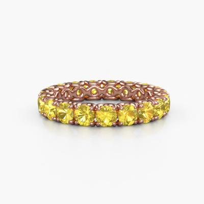 This is our Estee 3.4 ring. This specific type is called an eternity ring and it is set with a continuous line of identically cut gemstones. The ring is made in 14 Carat rose gold and is set with small yellow sapphire, 3.4 mm. The amazing yellow sapphire are identical in size and are set in the ring band. Our yellow sapphire are selected with great care so they are identical, which gives the best result. In order to get the best result, our artisans position all yellow sapphire by hand with the utmost care. Our Goldsmiths have one ambition, which is creating the perfect ring. That is why we love what we do. In the end you get a stunning modern rose gold stackable ring with a row of yellow sapphire which seem to have no beginning nor end. The perfect symbol of your undying love for her! How special is that!By using a combination of the latest modern techniques, combined with ancient crafting, we can make all our rings in our own studio. Each jewel is made to order. This is advantageous because we can offer you a price you won't find anywhere else.