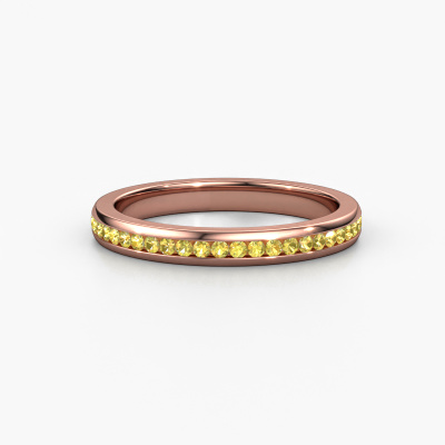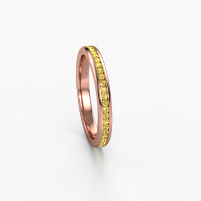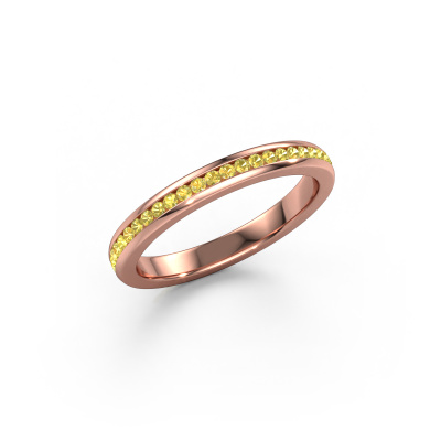 This is our Lura 1 ring. This specific type is called an eternity ring and it is set with a continuous line of identically cut gemstones. The ring is made in 14 Carat rose gold and is set with small yellow sapphire, 1.3 mm. The amazing yellow sapphire are identical in size and are set in the ring band. Our yellow sapphire are selected with great care so they are identical, which gives the best result. In order to get the best result, our artisans position all yellow sapphire by hand with the utmost care. Our Goldsmiths have one ambition, which is creating the perfect ring. That is why we love what we do. In the end you get a stunning modern rose gold stackable ring with a row of yellow sapphire which seem to have no beginning nor end. The perfect symbol of your undying love for her! How special is that!Because we design and deliver our own rings, we can offer you a ring at a price you won't find anywhere else. A ring is made to order, which helps prevent excess supplies, so we can make you a great price offer. We understand it feels risky, buying your ring online, but we will gladly assist in the designing process, taking your budget into consideration.Our talented designers add new designs to our online collection daily. Together they create a diverse collection of the finest jewellery. If you prefer to make a ring according your own design, please feel free to request a quote. We will make you an amazing offer, based on quality and price.To make it easier for you, we offer a 30 day return policy. Check our terms and conditions.