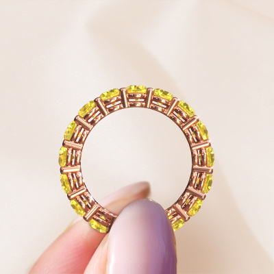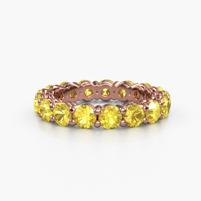 This is our Michelle full 3.7 ring. This specific type is called an eternity ring and it is set with a continuous line of identically cut gemstones. The ring is made in 14 Carat rose gold and is set with small yellow sapphire, 3.7 mm. The amazing yellow sapphire are identical in size and are set in the ring band. Our yellow sapphire are selected with great care so they are identical, which gives the best result. In order to get the best result, our artisans position all yellow sapphire by hand with the utmost care. Our Goldsmiths have one ambition, which is creating the perfect ring. That is why we love what we do. In the end you get a stunning modern rose gold stackable ring with a row of yellow sapphire which seem to have no beginning nor end. The perfect symbol of your undying love for her! How special is that!Because we design and deliver our own rings, we can offer you a ring at a price you won't find anywhere else. A ring is made to order, which helps prevent excess supplies, so we can make you a great price offer. We understand it feels risky, buying your ring online, but we will gladly assist in the designing process, taking your budget into consideration.Our team of talented, passionate designers add new ring designs to our online collection daily. Our objective in doing so, is to be able to offer you a wide variety of jewels. Please feel free to request a quote if you have specific wishes for your ring. We guarantee to make you an offer you can't refuse.To make it easier for you, we offer a 30 day return policy. Check our terms and conditions.