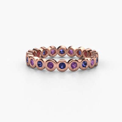 This is our Edwina 1 ring. This specific type is called an eternity ring and it is set with a continuous line of identically cut gemstones. The ring is made in 14 Carat rose gold and is set with small sapphire, 2 mm. This rose gold Eternity ring is a perfectly beautiful and meaningful way to give your proposal that special touch. The magnificent evenly shaped sapphire are pave set around the ring. The identical sapphire are carefully selected to give the ring a maximum effect. Do keep in mind we use natural resources so small differences between stones are common. The special effect is enhanced due to precise positioning of the sapphire. This requires the utmost precision and a skilful hand but for our skilled artisans this is what excites them. The result is a stackable ring with a row of sapphire which seem to have no beginning nor end. The perfect symbol of your love for her! Isn't she a beauty?By using our modern techniques, we can design and customize the finest quality jewels with the utmost care for you. Our rings are always priced 30 percent lower than other jewellers. We make rings to order, so we don't have to maintain a large stock. If you have a certain budget, we are more than happy to advice you accordingly.New jewellery designs are added to our online collection daily. Our team of passionate designers strive to create extraordinary and diverse designs. Have you seen a ring you like? Please feel free to contact us. Based on a good price/ quality ratio, we will make you an offer you can't refuse!To make it easier for you, we offer a 30 day return policy. Check our terms and conditions.
