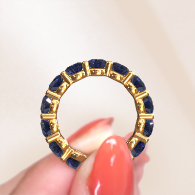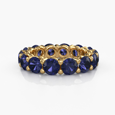 This is our Heddy rnd 4.7 ring. This specific type is called an eternity ring and it is set with a continuous line of identically cut gemstones. The ring is made in 14 Carat gold and is set with small sapphire, 4.7 mm. This gold Eternity ring is a perfectly beautiful and meaningful way to give your proposal that special touch. The magnificent evenly shaped sapphire are pave set around the ring. The identical sapphire are carefully selected to give the ring a maximum effect. Do keep in mind we use natural resources so small differences between stones are common. The special effect is enhanced due to precise positioning of the sapphire. This requires the utmost precision and a skilful hand but for our skilled artisans this is what excites them. The result is a ring with a row of sapphire which seem to have no beginning nor end. The perfect symbol of your love for her! Isn't she a beauty?Because we design and deliver our own rings, we can offer you a ring at a price you won't find anywhere else. A ring is made to order, which helps prevent excess supplies, so we can make you a great price offer. We understand it feels risky, buying your ring online, but we will gladly assist in the designing process, taking your budget into consideration.Our team of talented, passionate designers add new ring designs to our online collection daily. Our objective in doing so, is to be able to offer you a wide variety of jewels. Please feel free to request a quote if you have specific wishes for your ring. We guarantee to make you an offer you can't refuse.To make it easier for you, we offer a 30 day return policy. Check our terms and conditions.