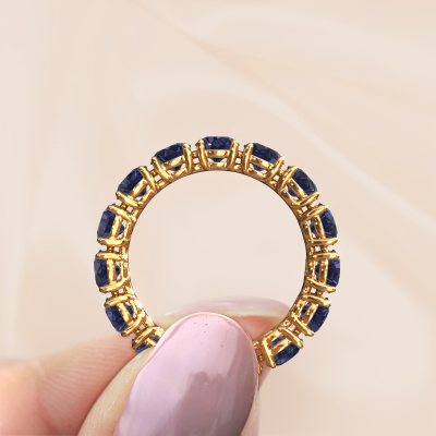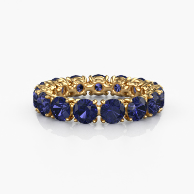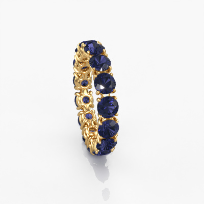 This is our Vivienne 4.2 ring. This specific type is called an eternity ring and it is set with a continuous line of identically cut gemstones. The ring is made in 14 Carat gold and is set with small sapphire, 4.2 mm. This gold Eternity ring is a perfectly beautiful and meaningful way to give your proposal that special touch. The magnificent evenly shaped sapphire are pave set around the ring. The identical sapphire are carefully selected to give the ring a maximum effect. Do keep in mind we use natural resources so small differences between stones are common. The special effect is enhanced due to precise positioning of the sapphire. This requires the utmost precision and a skilful hand but for our skilled artisans this is what excites them. The result is a ring with a row of sapphire which seem to have no beginning nor end. The perfect symbol of your love for her! Isn't she a beauty?By using a combination of the latest modern techniques, combined with ancient crafting, we can make all our rings in our own studio. Each jewel is made to order. This is advantageous because we can offer you a price you won't find anywhere else.