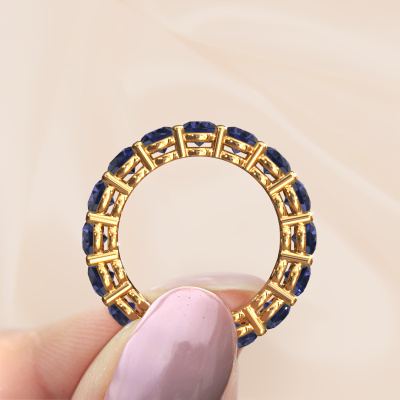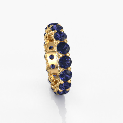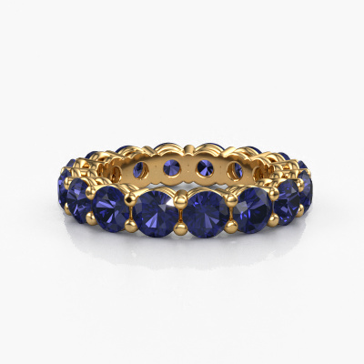 This is our Michelle full 4.2 ring. This specific type is called an eternity ring and it is set with a continuous line of identically cut gemstones. The ring is made in 14 Carat gold and is set with small sapphire, 4.2 mm. This gold Eternity ring is a perfectly beautiful and meaningful way to give your proposal that special touch. The magnificent evenly shaped sapphire are pave set around the ring. The identical sapphire are carefully selected to give the ring a maximum effect. Do keep in mind we use natural resources so small differences between stones are common. The special effect is enhanced due to precise positioning of the sapphire. This requires the utmost precision and a skilful hand but for our skilled artisans this is what excites them. The result is a stackable ring with a row of sapphire which seem to have no beginning nor end. The perfect symbol of your love for her! Isn't she a beauty?After receiving your order, our goldsmiths will start the creative process of making your Michelle full 4.2 ring. We don't keep stock. This is advantageous because these costs will not be passed on to you. Therefore, we can offer jewellery at exceptionally low prices.New jewellery designs are added to our online collection daily. Our team of passionate designers strive to create extraordinary and diverse designs. Have you seen a ring you like? Please feel free to contact us. Based on a good price/ quality ratio, we will make you an offer you can't refuse!To make it easier for you, we offer a 30 day return policy. Check our terms and conditions.