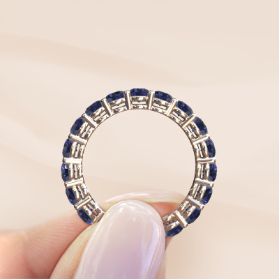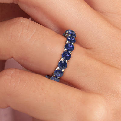 This is our Michelle full 3.4 ring. This specific type is called an eternity ring and it is set with a continuous line of identically cut gemstones. The ring is made in platinum and is set with small sapphire, 3.4 mm. This platinum Eternity ring is a perfectly beautiful and meaningful way to give your proposal that special touch. The magnificent evenly shaped sapphire are pave set around the ring. The identical sapphire are carefully selected to give the ring a maximum effect. Do keep in mind we use natural resources so small differences between stones are common. The special effect is enhanced due to precise positioning of the sapphire. This requires the utmost precision and a skilful hand but for our skilled artisans this is what excites them. The result is a stackable ring with a row of sapphire which seem to have no beginning nor end. The perfect symbol of your love for her! Isn't she a beauty?By using a combination of the latest modern techniques, combined with ancient crafting, we can make all our rings in our own studio. Each jewel is made to order. This is advantageous because we can offer you a price you won't find anywhere else.New jewellery designs are added to our online collection daily. Our team of passionate designers strive to create extraordinary and diverse designs. Have you seen a ring you like? Please feel free to contact us. Based on a good price/ quality ratio, we will make you an offer you can't refuse!To make it easier for you, we offer a 30 day return policy. Check our terms and conditions.